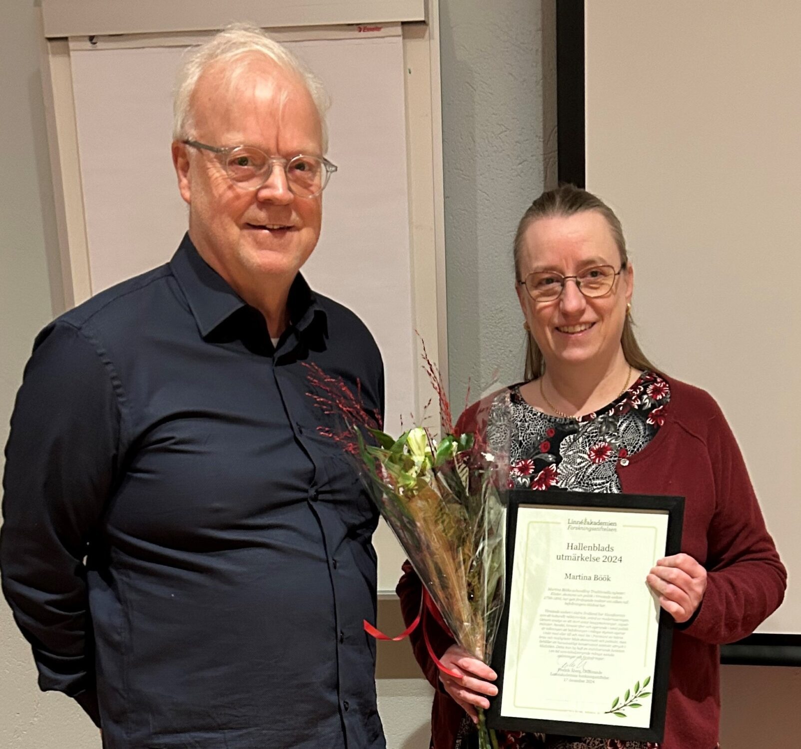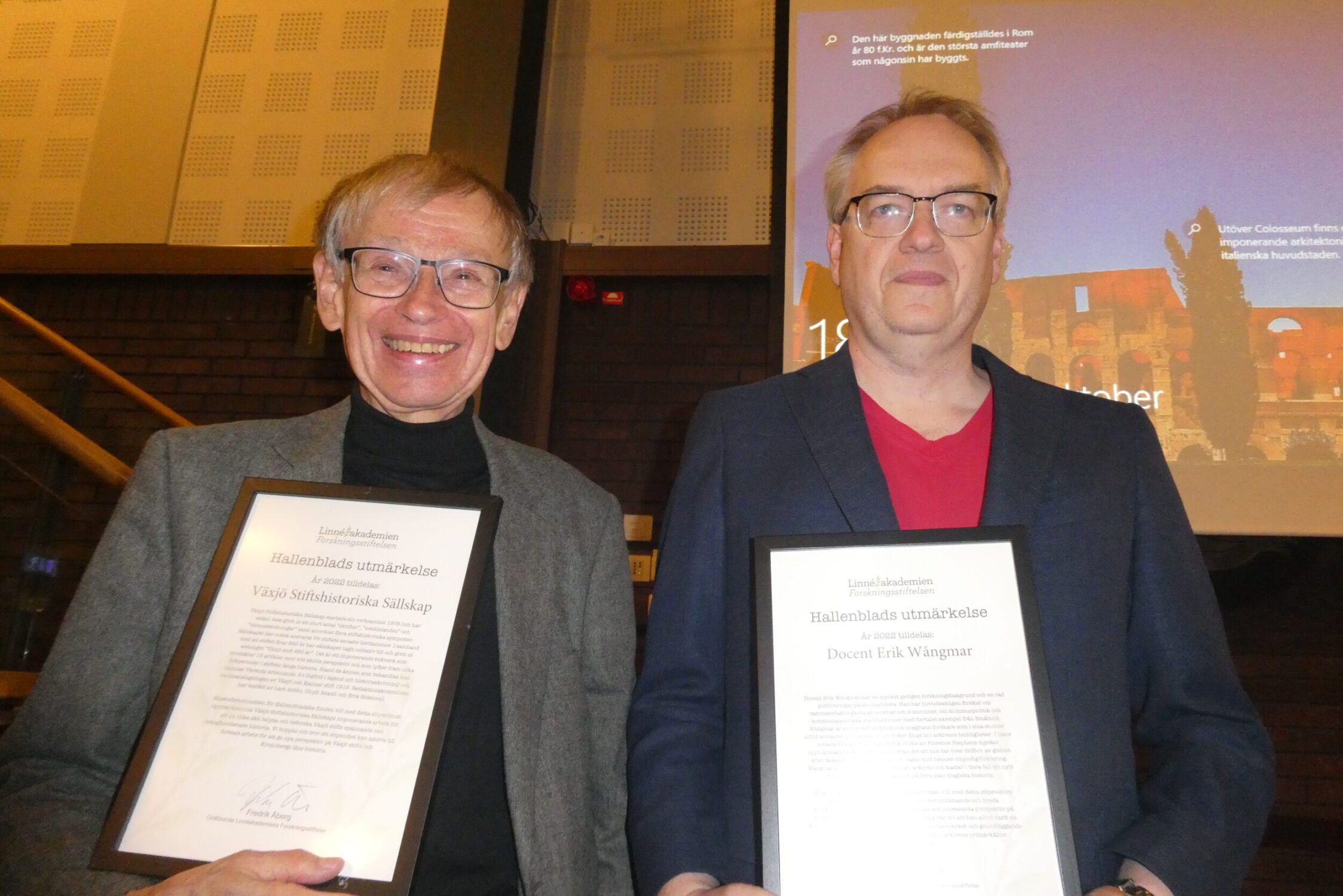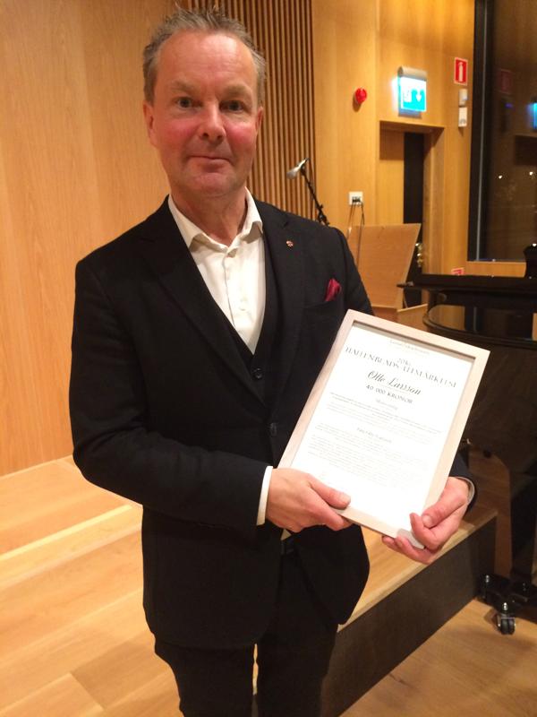 Hallenblads utmärkelse, 40 000 kronor, fick Olle Larsson den 19 oktober och som en överraskning när han föreläste för Historiska föreningen i Växjö.